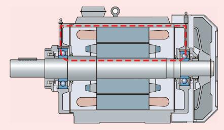 在定子繞組的三相之間,共模干擾產(chǎn)生不對稱電流,圍繞定子周圍的電流總和不為0。圍繞軸的高頻流變化產(chǎn)生了高頻軸電壓。因此,軸向流動(dòng)的電流很危險(xiǎn),該電流可穿過轉(zhuǎn)子軸、軸承、定子以及后面的其他軸承(圖5)。