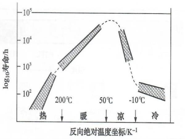 圖3 Smith和Wilson提出的潤滑脂壽命是溫度的函數(shù)以及標準潤滑脂的溫度范圍