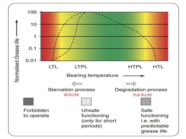 在低溫性能極限(temperature performance limit,LTPL)和高溫性能極限(high temperature performance limit,HTPL)之間的溫度范圍,潤滑脂能可靠地發(fā)揮其性能特點,主要體現(xiàn)在油膜形成能力、分油性能、氧化速率以及流變性等。基礎(chǔ)油黏度、潤滑脂表觀黏度、氧化以及其他潤滑脂性能表現(xiàn)出“Arhenius”行為。即潤滑脂的性能與溫度或多或少地成指數(shù)關(guān)系。因此在綠色的溫度區(qū)域,潤滑脂壽命也表現(xiàn)出“阿倫尼烏斯”行為,那么在綠色溫度區(qū)域就可以合理地預(yù)測潤滑脂壽命。在高溫性能極限溫度( HTPL)與高溫極限( HTL)之間的黃色溫度區(qū)域內(nèi)運行,潤滑脂壽命會非常短。低溫區(qū)域也存在著黃色溫度區(qū)域。