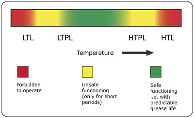 所有潤滑脂產(chǎn)品在設(shè)計時都考慮到工作溫度的范圍,如果溫度太高,潤滑脂將會軟化變稀而喪失稠度和/或發(fā)生劇烈的氧化;如果溫度太低,將導(dǎo)致軸承的啟動轉(zhuǎn)矩非常高和/或潤滑脂分油很低,這可以用交通燈概念的圖1和圖2來說明。低溫極限(low temperature limit ,LTL)是潤滑脂能夠使軸承毫無困難地啟動時的最低溫度;高溫極限(high temperature limit , HTL)是由潤滑脂稠化劑決定的,對于皂基潤滑脂來說,是由潤滑脂的滴點決定。滴點溫度表明,溫度高于滴點時潤滑脂的稠度損失是不可逆的,潤滑脂將變?yōu)橐后w。不建議潤滑脂在低溫極限和高溫極限之外工作(圖1和圖2)。