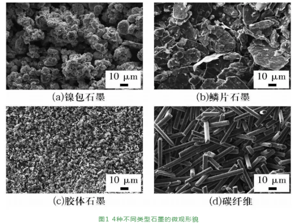 4種類型的石墨在掃描電子顯微鏡下的微觀形貌如圖1所示,由圖可知:采用濕法氫還原工藝制備的鎳包石墨(圖1a) ,在石墨顆粒外部包裹一層鎳形成具有核-殼結(jié)構(gòu)的復(fù)合顆粒材料;鱗片石墨(圖1b)則呈鮮明的片狀結(jié)構(gòu)且片層很薄,小于1μm,具有明顯的定向排列,層與層之間合力較弱,片層之間極易剝離;由于膠體石墨(圖1c)由2μm以下的顆粒形成,比其他3種石墨顆粒細小,且石墨顆粒均勻分布在有機溶劑中;碳纖維(圖1d)呈現(xiàn)棒狀形貌,其長徑比約為1:10~ 1:20。
