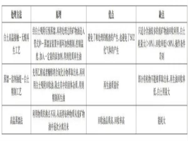 幾種資源化處理方法,有土高溫接觸-無酸再生工藝、蒸餾-溶劑抽提-白土精制工藝、高溫蒸餾法,詳見表3。