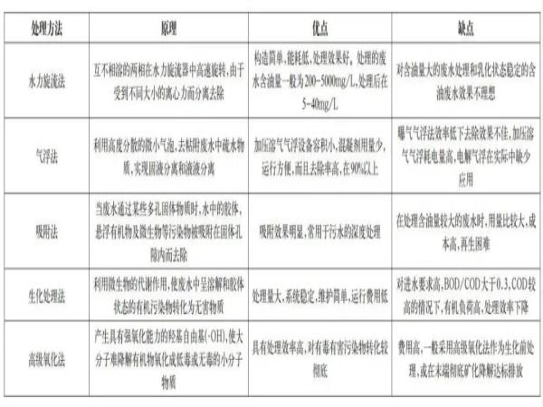 切削液廢水在進行破乳預處理后,必須要進行深度處理才能排放,深度處理主要是去除廢水中部分油類物質(zhì)和溶解性有機物、懸浮物、氨氮等等。幾種無害化處理方法比較,有水力旋流法、氣浮法、吸附法、生化處理法、高級氧化法,詳見表2。