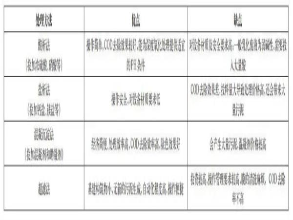 切削廢液因其成分復雜,化學穩(wěn)定性好,故直接處理難度較大,一般需要做預處理。預處理主要是對廢液進行破乳,以除去廢液中油包水或者水包油中的油類物質(zhì)。幾種破乳方法比較,有酸析法、鹽析法、混凝沉淀法,詳見表1。