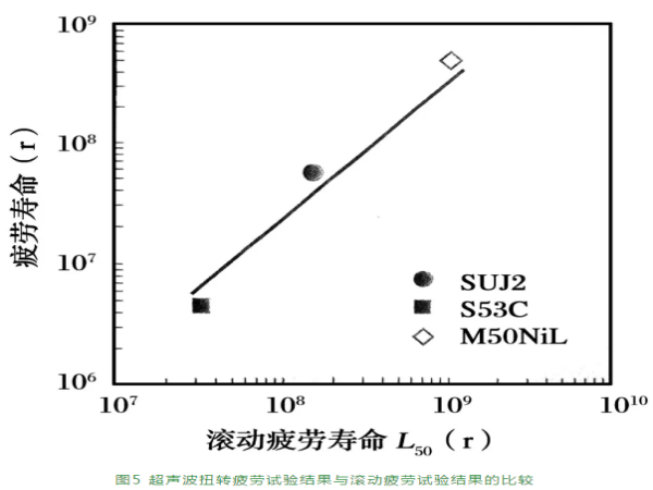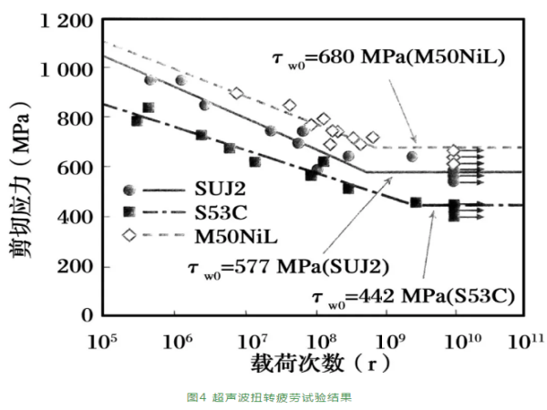 超聲波扭轉(zhuǎn)疲勞試驗(yàn)機(jī)主要由扭轉(zhuǎn)振動(dòng)變換器(激振頻率為(20 000±500)Hz)、放大器、扭轉(zhuǎn)振動(dòng)放大變幅桿等組成。采用本試驗(yàn)機(jī)評價(jià)高碳鉻軸承鋼SUJ2、結(jié)構(gòu)碳鋼S53C、高溫滲碳鋼M50NiL的結(jié)果如圖4所示。根據(jù)時(shí)間強(qiáng)度、疲勞極限來評價(jià),那么S53C最低,M50NiL最高。