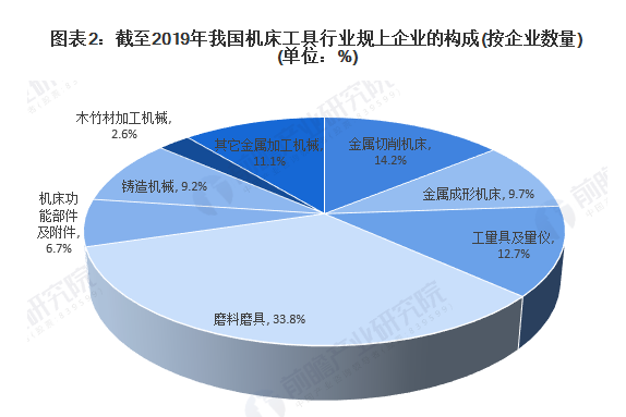 機(jī)床工具行業(yè)企業(yè)結(jié)構(gòu)方面,截至2019年12月,我國機(jī)床工具行業(yè)規(guī)模以上企業(yè)總數(shù)共5710家,涉及八個分行業(yè),包括金屬切削機(jī)床、金屬成形機(jī)床、工量具及量儀、磨料磨具、機(jī)床功能部件及附件等。其中磨料磨具企業(yè)數(shù)量最多,達(dá)到1947家,占比達(dá)到33.8%,其次金屬切削機(jī)床企業(yè)為816家,占比為14.2%。