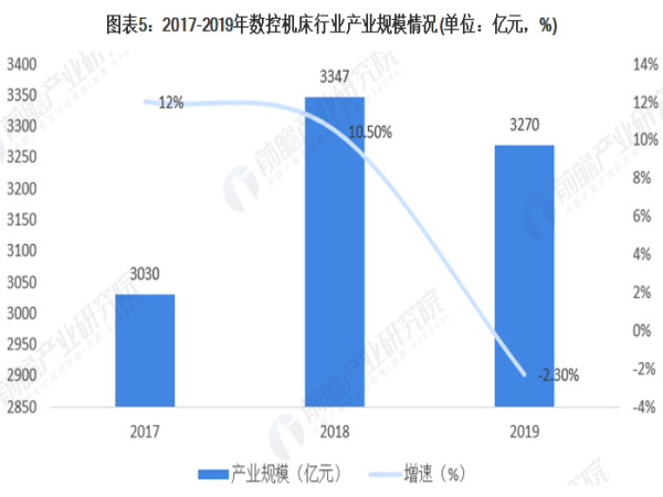 數(shù)控機(jī)床方面,受數(shù)控機(jī)床行業(yè)整體需求結(jié)構(gòu)調(diào)整及升級,下游領(lǐng)域不景氣影響,2019年我國數(shù)控機(jī)床產(chǎn)業(yè)規(guī)模為3270億元,同比下降2.30%。