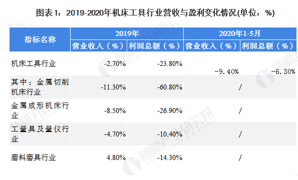根據(jù)國家統(tǒng)計局規(guī)模以上企業(yè)統(tǒng)計數(shù)據(jù),機(jī)床工具行業(yè)2019年累計完成營業(yè)收入同比降低2.7%,利潤總額同比降低23.8%。其中除了磨料磨具行業(yè)營業(yè)收入實(shí)現(xiàn)增長之外,其他均下降。2020年1-5月機(jī)床工具行業(yè)規(guī)模以上企業(yè)完成營業(yè)收入同比降低9.4%。