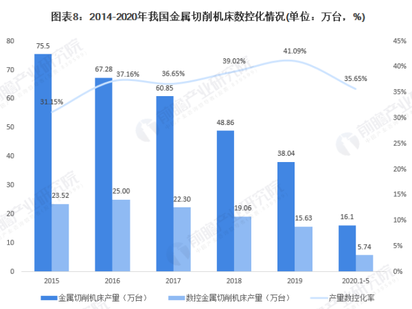 從機(jī)床具體數(shù)控化率來看,金屬切削機(jī)床行業(yè)是機(jī)床工具行業(yè)中經(jīng)濟(jì)規(guī)模最大、地位最顯著的產(chǎn)業(yè)領(lǐng)域。我國金屬切削機(jī)床產(chǎn)量數(shù)控化率波動提升,從2015年的31.15%上升至2019年的41.09%。隨著自動化、數(shù)字化潮流的興起,數(shù)控機(jī)床得到了快速發(fā)展,機(jī)床行業(yè)數(shù)控化率持續(xù)提高。