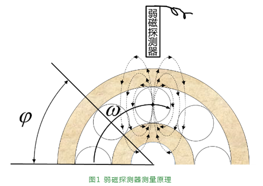 保持架實(shí)測(cè)轉(zhuǎn)速nm可通過實(shí)測(cè)頻率fm計(jì)算得到,弱磁探測(cè)技術(shù)的測(cè)量原理如圖1所示,每個(gè)滾動(dòng)體都存在一定強(qiáng)度的弱磁場(chǎng),當(dāng)滾動(dòng)體通過弱磁探測(cè)傳感器時(shí),其弱磁場(chǎng)在每φ弧度產(chǎn)生一次交變的激勵(lì)信號(hào),該信號(hào)被弱磁探測(cè)器識(shí)別并通過特定的檢測(cè)電路將其頻率信息進(jìn)行提取與計(jì)算,從而得到實(shí)測(cè)頻率fm。