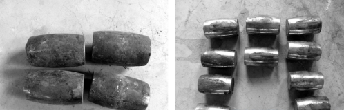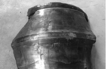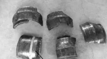 此調(diào)心滾子軸承在運轉(zhuǎn)過程中導(dǎo)致嚴重損壞,內(nèi)圈表面嚴重?zé)齻罱K導(dǎo)致軸承失效,無法使用。圖1為此軸承的整體外圈,圖2為此軸承內(nèi)圈碎片及軸套外觀,圖3位此軸承的滾子表面圖,圖4為此軸承的保持架。