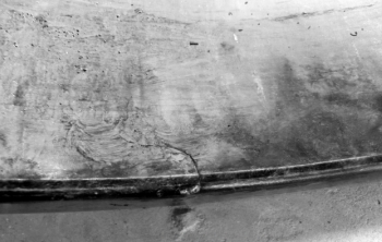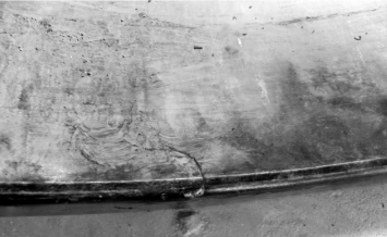 一裂紋從外圈端面延伸至滾道表面( 圖 5) ;外圈滾道上運轉(zhuǎn)軌跡發(fā)生偏斜,一側(cè)磨痕靠近一端面倒角處,另一側(cè)磨痕距另一側(cè)端面處約30 mm,滾道表面有燒傷現(xiàn)象,如圖 6 所示。