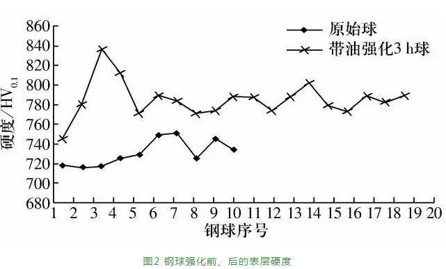 鋼球強(qiáng)化前、后的表層硬度如圖2所示,強(qiáng)化后的鋼球表層硬度明顯增加,平均硬度由731HV0.1提高到785HV0.1 。