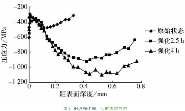 強(qiáng)化后的鋼球表層應(yīng)力增加70%~88%,表層硬度明顯提高,表面沒(méi)有明顯變質(zhì)層。