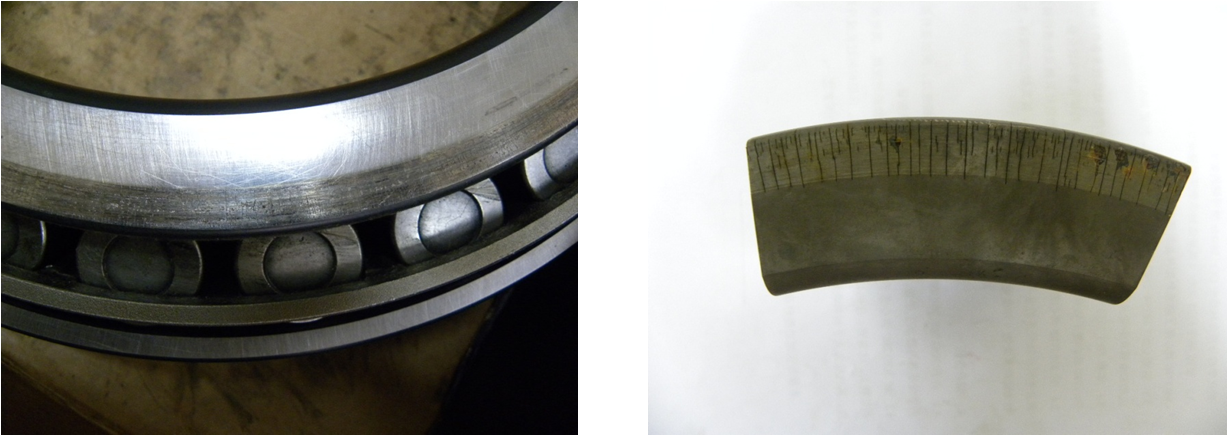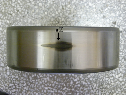 不對(duì)中或偏載。軸撓曲后,內(nèi)圈相對(duì)于外圈傾斜導(dǎo)致滾道邊緣承載,在滾道邊緣與油溝處形成剝落并向滾道中部擴(kuò)展。