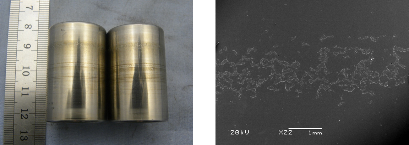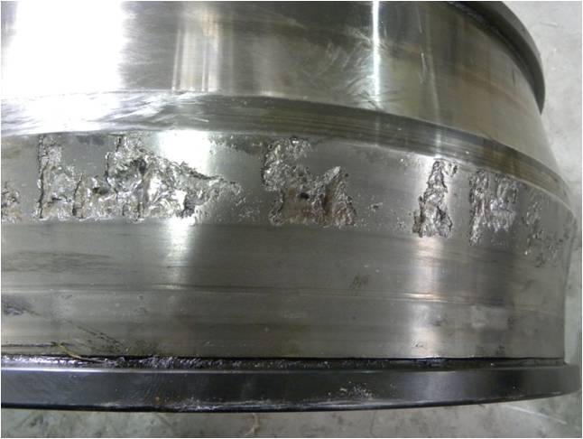 當(dāng)電流通過(guò)滾動(dòng)體和潤(rùn)滑油膜從軸承的一個(gè)套圈傳遞到另一套圈時(shí),由于絕緣不適當(dāng)或絕緣不良,在接觸區(qū)內(nèi)會(huì)發(fā)生擊穿放電。在套圈和滾動(dòng)體之間的接觸區(qū),電流強(qiáng)度增大,造成在非常短的時(shí)間間隔內(nèi)局部受熱,使接觸區(qū)發(fā)生熔化并焊合在一起。