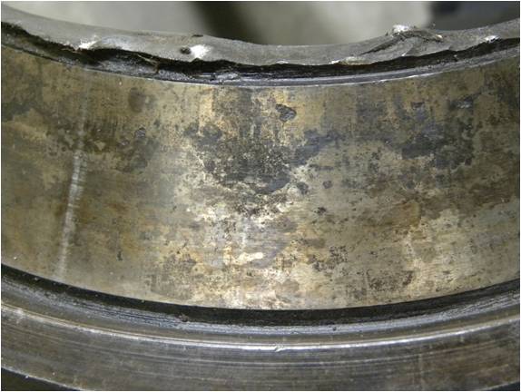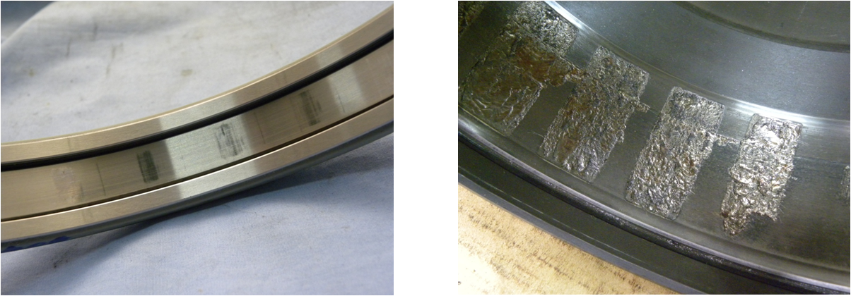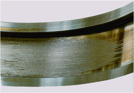 涂抹:由于滾動(dòng)體承載較輕并且在其反復(fù)進(jìn)入承載區(qū)時(shí),受到強(qiáng)烈的加速作用,因此,在滾動(dòng)體和滾道之間會(huì)發(fā)生涂抹(滑傷);當(dāng)載荷相對(duì)于轉(zhuǎn)速過(guò)小時(shí),滾動(dòng)體和滾道之間也會(huì)發(fā)生涂抹,這樣的涂抹也稱(chēng)之為“輕載打滑”。打滑嚴(yán)重的情況下滾道表面會(huì)出現(xiàn)高溫變色痕跡。