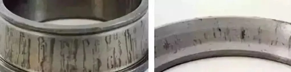 當(dāng)軸承內(nèi)圈強(qiáng)制套入軸頸后,輕者將使?jié)L道底部產(chǎn)生嚴(yán)重磨損的環(huán)形軌跡,重者在滑道內(nèi)、外圈和滾珠上均會有裂口或剝皮。