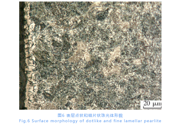 如果球化退火保溫后冷卻速度過(guò)快,將會(huì)干擾或終止表層已溶斷滲碳體的球化過(guò)程,并使表層出現(xiàn)細(xì)小、密集分布的粒狀碳化物(俗稱密團(tuán)),甚至出現(xiàn)共析細(xì)片狀珠光體(圖6)。這一區(qū)域只有碳化物形態(tài)的異常,無(wú)碳化物明顯減少的現(xiàn)象,由于該區(qū)域組織與球化欠熱組織相同,亦可稱為表層欠熱。這種缺陷組織往往可通過(guò)返修或拉拔變形+再結(jié)晶退火使次表層得到正常組織,但應(yīng)特別注意的是將表層的脫碳層與冷速過(guò)快造成的異常組織(細(xì)片狀珠光體)區(qū)分開(kāi),絕不能混為一體。