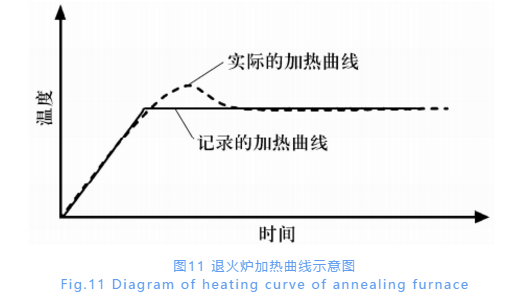 退火爐的加熱曲線一般不會(huì)記錄到這種沖溫現(xiàn)象,這是由于退火爐內(nèi)熱電偶放置部位不能反映鋼材實(shí)際的加熱溫度(圖11)。