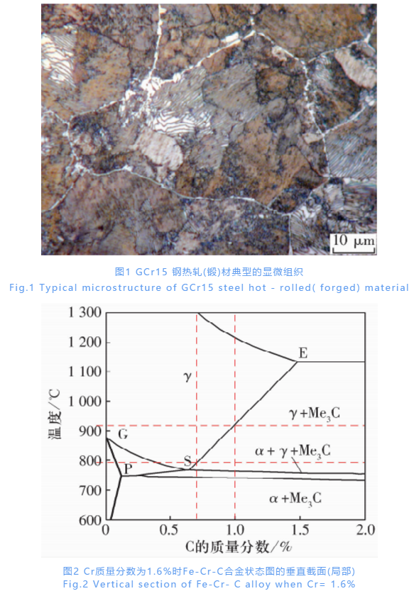 GCr15鋼球化退火的原材料組織為熱軋(鍛)材,其顯微組織為索氏體、細(xì)片狀珠光體或兩者的混合體,亦允許有較細(xì)的碳化物網(wǎng)(圖1)。圖2中含碳量1%的垂直線可近似地反映出GCr15鋼在加熱和冷卻過(guò)程中的組織轉(zhuǎn)變狀況。GCr15鋼球化退火溫度在790°C左右的奧氏體+滲碳體兩相區(qū)中,經(jīng)保溫和緩冷后奧氏體中的片狀滲碳體和奧氏體晶界上較薄的網(wǎng)狀滲碳體逐漸溶斷轉(zhuǎn)變成球狀滲碳體,從而得到球狀珠光體組織。