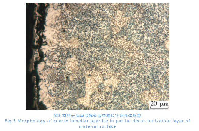 由于原材料表面脫碳層的含碳量較基體有所降低,在790℃左右加熱時(shí)已超過(guò)或接近圖2所示的SE相變線,脫碳層的奧氏體成分已完全均勻化或部分均勻化,此后冷卻就會(huì)得到全部或部分粗片狀珠光體組織(圖3)。這說(shuō)明熱軋(鍛)材表面的部分脫碳層會(huì)使球化退火相變溫度降低,若表層脫碳較嚴(yán)重,則球化退火后會(huì)轉(zhuǎn)變?yōu)榇制瑺钪楣怏w,這是最常見(jiàn)的一種脫碳層,在盤條上,一般僅存在于局部表面。粗片狀珠光體分布的最大深度即代表所檢試樣的脫碳層深度。
