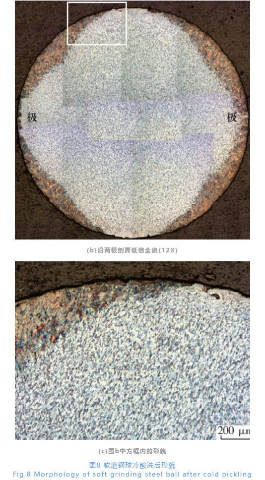 對(duì)球化退火材料進(jìn)行金相檢驗(yàn)時(shí),有時(shí)會(huì)發(fā)現(xiàn)經(jīng)蝕劑浸蝕的表面存在深度一致的深灰色層,該層與黃灰色基體有明顯的色差,嚴(yán)重的甚至可觀察到粗晶現(xiàn)象,典型形貌如圖7所示,這是熱軋材退火時(shí)因加熱速度過(guò)快沖溫而產(chǎn)生的粗片狀珠光體層。軟磨鋼球冷酸洗后赤道與兩極之間呈黑色,經(jīng)分析黑色區(qū)組織即為粗片狀珠光體,其形貌如圖8所示。