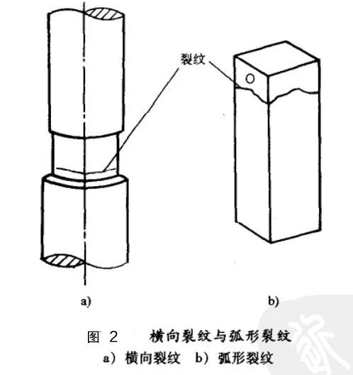 如圖1所示,也稱為軸向裂紋,是典型的由組織應(yīng)力(切向應(yīng)力)引發(fā)的裂紋,由表面向內(nèi)開裂,裂紋深而長(zhǎng)。常發(fā)生于淬透的工件。鋼中有嚴(yán)重的帶狀碳化物偏析或沿縱向排列的非金屬夾雜物等缺陷會(huì)增大形成縱向裂紋的敏感性。