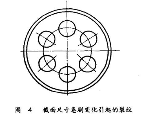 冷卻時(shí)在厚薄相差懸殊的部分馬氏體相變的時(shí)間差很大,形成很大的組織應(yīng)力,以致產(chǎn)生裂紋,如圖4所示: