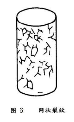 這種裂紋具有任意方向性而與工件的形狀無(wú)關(guān),如圖6所示。網(wǎng)狀裂紋的深度一般在0.01-0.15mm范圍內(nèi),是一種表面裂紋,高碳工具鋼和合金工具鋼表面脫碳后淬火易形成網(wǎng)狀裂紋。