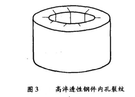 鋼的淬透性足夠大時(shí)內(nèi)孔表面的內(nèi)應(yīng)力以組織應(yīng)力為主,切向拉應(yīng)力較大,易在內(nèi)孔壁上形成沿縱向分布的裂紋,從端面看呈放射狀,如圖3所示。