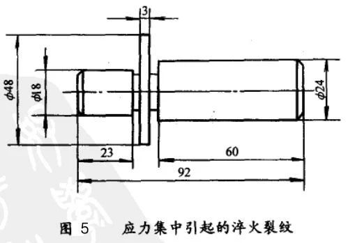 鋼件上有尖角、缺口等存在的情況下,易在淬火時(shí)造成應(yīng)力集中而產(chǎn)生裂紋,尤其是在應(yīng)力集中和截面尺寸急劇變化的共同作用下,淬裂的危險(xiǎn)更大,如圖5中3mm厚的凸緣根部很容易開裂。
