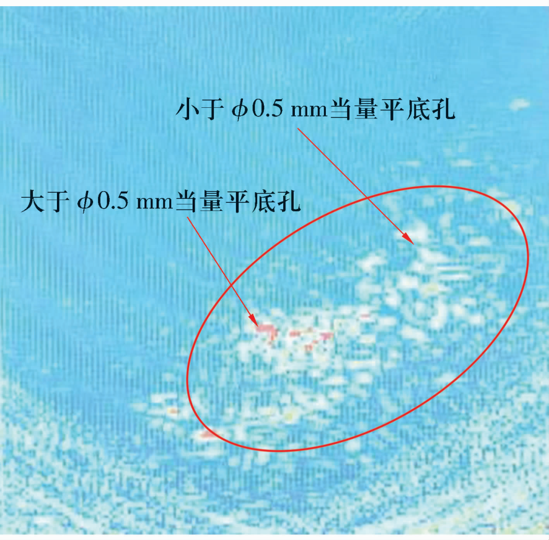 采用對比試塊法,考慮到內(nèi)部過燒缺陷常常體積較小,從單個缺陷定量和密集型缺陷定量兩方面考慮,綜合實踐經(jīng)驗,級別定為φ0.5 mm當量平底孔。