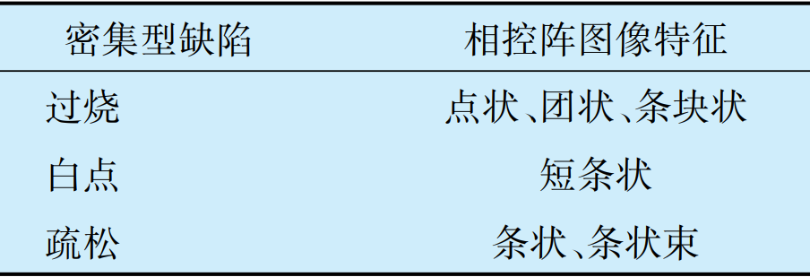 軸承零件中密集型內(nèi)部缺陷為過燒、白點和疏松等,檢測到的相控陣圖像特征見表1。從相控陣圖像特征上,可初步判斷出密集型缺陷的性質(zhì)。
