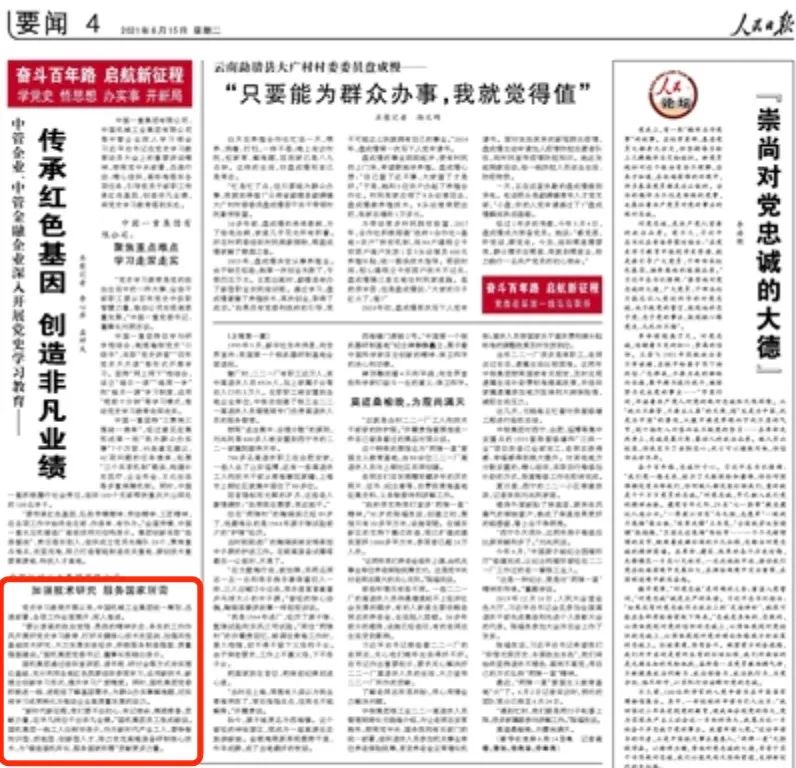 黨史學(xué)習(xí)教育開展以來,國機集團統(tǒng)一籌劃、迅速部署,高標(biāo)準(zhǔn)落實各項任務(wù),并把黨史學(xué)習(xí)教育同總結(jié)經(jīng)驗、觀照現(xiàn)實、推動工作相結(jié)合,與推進企業(yè)改革發(fā)展相結(jié)合,取得一系列實踐成果,把學(xué)黨史、悟思想、辦實事、開新局落到實處。6月15日,《人民日報》在要聞版報道了集團黨史學(xué)習(xí)教育的相關(guān)工作。