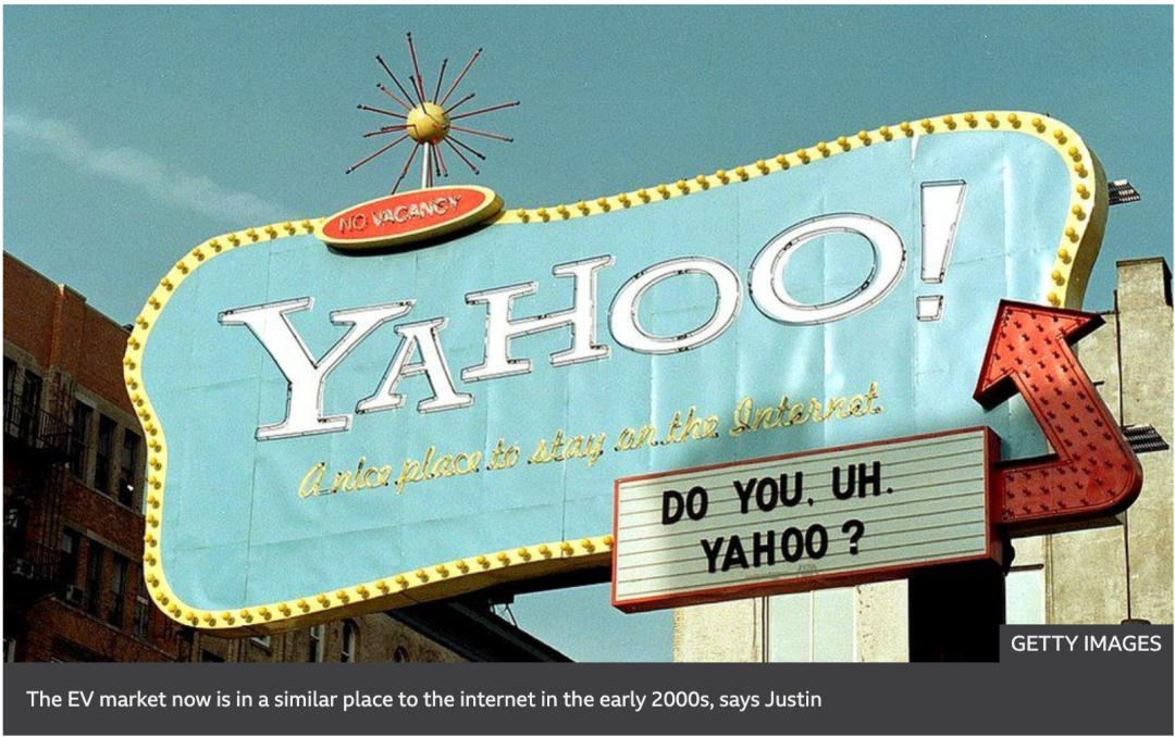 據(jù)估計(jì),目前的電動(dòng)汽車市場(chǎng),頗有些類似于20世紀(jì)90年代末或21世紀(jì)初互聯(lián)網(wǎng)的發(fā)展境況。那時(shí)候,人們對(duì)互聯(lián)網(wǎng)這一新鮮事物還議論紛紛。杰夫?貝索斯剛剛創(chuàng)立亞馬遜不久,谷歌(Google)則開始搶占Altavista、askjeeves和雅虎等老牌傳統(tǒng)搜索公司的互聯(lián)網(wǎng)搜索和廣告業(yè)務(wù);一些互聯(lián)網(wǎng)公司的估值令人瞠目結(jié)舌。