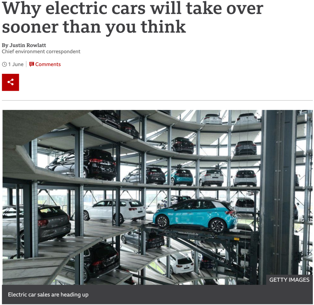 英國(guó)BBC首席環(huán)境記者Justin Rowlatt發(fā)表題為《為什么電動(dòng)汽車會(huì)比人們的想象來的要快?》(Why electric cars will take over sooner than you think)的文章指出,自1913年亨利·福特的第一條生產(chǎn)線開始生產(chǎn)以來,我們正處于汽車業(yè)最大的革命之中,而且這場(chǎng)革命很可能發(fā)生得比所有人想象的要快得多。許多行業(yè)觀察家認(rèn)為,全球已經(jīng)越過了一個(gè)轉(zhuǎn)折點(diǎn),電動(dòng)汽車的銷量將迅速超過汽油和柴油汽車。