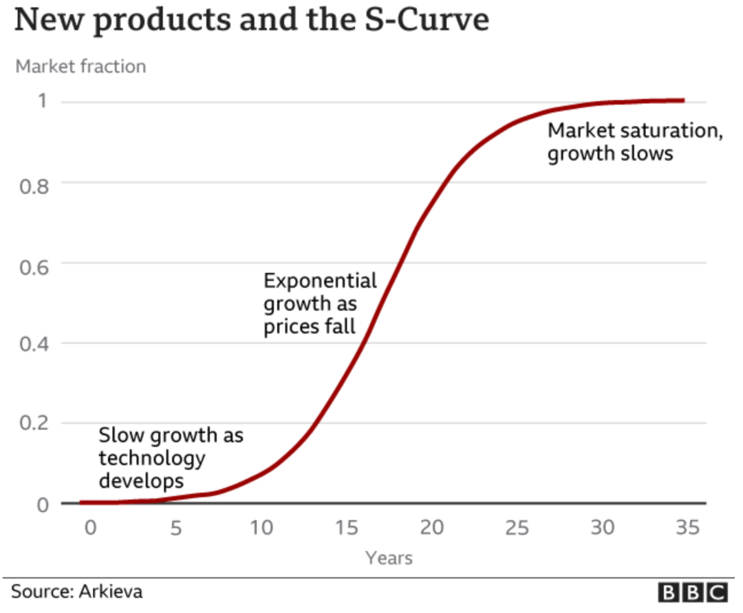 這背后的原因在于另一條曲線——制造商稱之為“學(xué)習(xí)曲線”。當(dāng)我們生產(chǎn)的東西越多,制作得越好,就越便宜。這就是為什么個(gè)人電腦、廚房電器以及汽油和柴油汽車變得如此實(shí)惠的原因,電動(dòng)汽車的發(fā)展,毫無疑問也將遵循這一規(guī)律曲線。