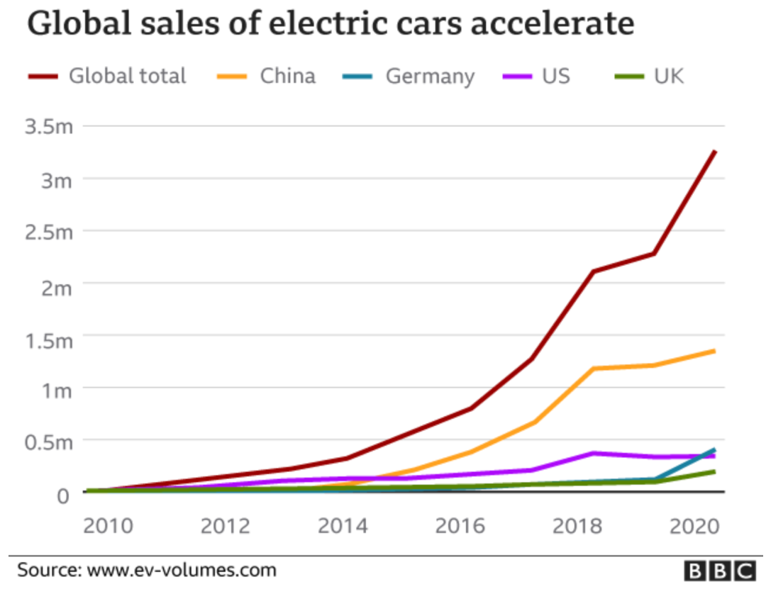 在新冠疫情大流行期間,2020年全球電動(dòng)汽車銷量仍取得快速增長(zhǎng),增長(zhǎng)達(dá)43%,賣出了320萬輛。雖然電動(dòng)汽車依然只占各類汽車總銷量的5%,但這表明我們已經(jīng)進(jìn)入了快速增長(zhǎng)曲線的陡峭上升階段。據(jù)投資銀行瑞銀(UBS)的最新預(yù)測(cè),到2025年全球新車銷量的20%將是電動(dòng)汽車,到2030年這一比例將躍升至40%,到2040年全球銷售的幾乎每輛新車都將是電動(dòng)汽車。