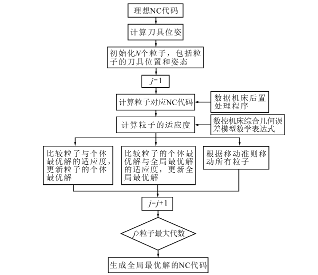 軟件補(bǔ)償是基于機(jī)床誤差預(yù)測(cè)模型發(fā)展的,通常在幾何誤差檢測(cè)、辨識(shí)后建立機(jī)床的加工誤差預(yù)測(cè)模型后,根據(jù)誤差預(yù)測(cè)模型計(jì)算得到工件加工過程刀尖點(diǎn)的空間位置誤差,通過進(jìn)行坐標(biāo)系零點(diǎn)偏置、修改NC代碼或在控制系統(tǒng)中增加前反饋補(bǔ)償?shù)牟僮鞣绞降毒咛岣呖臻g定位精度。Shen H.等基于五軸數(shù)控機(jī)床的誤差預(yù)測(cè)模型,提出了修改坐標(biāo)偏置幾何誤差補(bǔ)償方法,有效地補(bǔ)償了機(jī)床幾何誤差及熱誤差。余文利等提出了基于粒子群優(yōu)化算法的數(shù)控幾何誤差補(bǔ)償方法,通過NC代碼優(yōu)化工件,有效地提高了數(shù)控機(jī)床精度,補(bǔ)償流程如圖4所示。