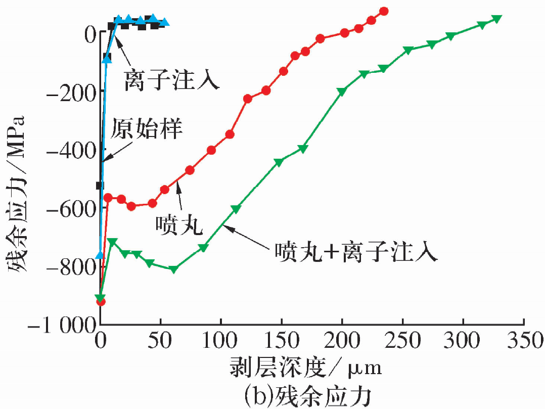 復(fù)合處理后8Cr4Mo4V鋼表面N元素分布和應(yīng)力梯度結(jié)果如圖15所示,單一離子注入處理后8Cr4Mo4V鋼改性層深度僅約5 μm,而復(fù)合處理后8Cr4Mo4V鋼表面氮濃度遠高于僅離子注入試樣,且在30 μm處N原子數(shù)分數(shù)仍超過10%;盡管單一離子注入處理對應(yīng)力幾乎無影響,但其與噴丸處理耦合時卻可以大幅增加壓應(yīng)力的幅值和深度。文獻[47]認為這是由于噴丸產(chǎn)生的缺陷為N原子向試樣內(nèi)部快速擴散提供了通道,而N原子以過飽和固溶體存在于晶格和缺陷中,使點陣膨脹形成附加壓應(yīng)力,提高了噴丸強化效果。