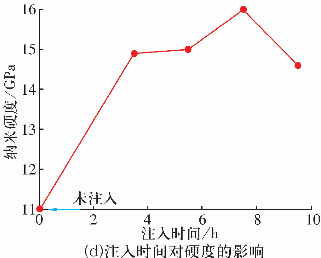 文獻[35]采用N元素等離子體離子注入技術(shù)對8Cr4Mo4V鋼進行表面改性,獲得了厚度達22 μm的改性層,并深入研究離子注入?yún)?shù)對其組織、性能的影響規(guī)律及機制,結(jié)果如圖10所示,注入層的納米硬度相較于8Cr4Mo4V鋼基體可提高45%,可顯著提高材料的耐磨性能;且離子注入過程可在8Cr4Mo4V鋼表面引入一定的殘余壓應(yīng)力。