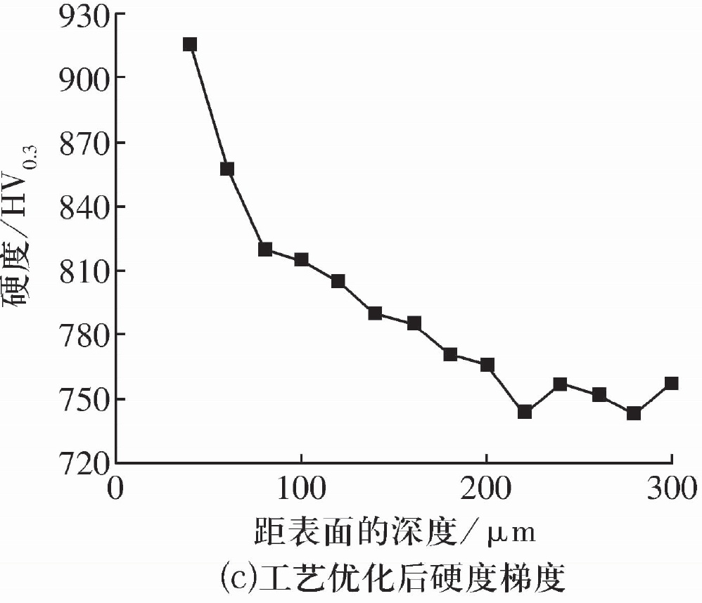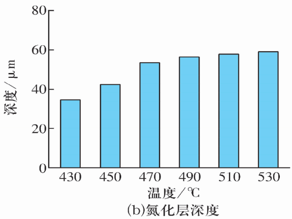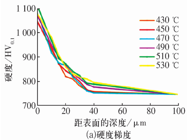 文獻[27]進行了8Cr4Mo4V鋼離子滲氮研究工作,利用陽極層離子源輔助滲氮技術(shù)在不同溫度下進行8Cr4Mo4V鋼氮化處理,材料表面硬度梯度及滲氮層深度如圖7a和圖7b所示。由圖7可知:隨著滲氮溫度的升高,滲氮試樣的表面硬度略微增加,最高表面硬度達1 100 HV0.1;滲氮溫度的升高使氮原子擴散系數(shù)增加,導致530 ℃的滲層深度比430 ℃的增加了近一倍。但8Cr4Mo4V鋼氮化層深度較淺不能滿足8Cr4Mo4V鋼性能提升需求;進行工藝改進后,8Cr4Mo4V鋼氮化層深度達120 μum,這將大大提升8Cr4Mo4V鋼抗疲勞性能。