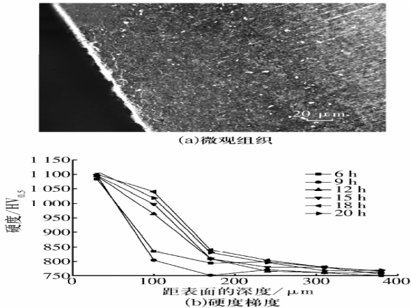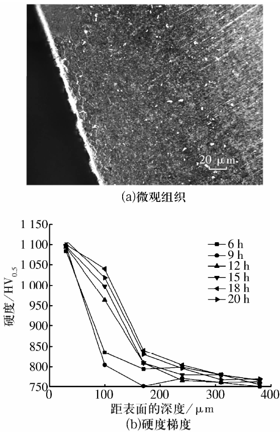 除真空離子氮化技術(shù)外,文獻[28]開展了8Cr4Mo4V鋼鹽浴氮化技術(shù)研究。氮化后其微觀組織形貌及硬度梯度如圖8所示,盡管8Cr4Mo4V鋼表面硬度得到了大幅度提升,但該氮化方式使其表面存在脆性的“白亮層”及脈狀組織,對材料性能可能產(chǎn)生不利影響。
