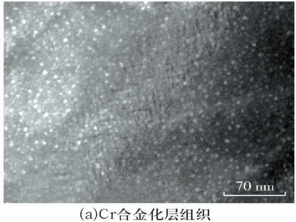 強流脈沖電子束表面合金化技術(shù)通常包括2個過程:首先在材料表面進行鍍膜處理,然后利用高能電子束轟擊材料表面,從而改變材料表面熔化層,產(chǎn)生成分和組織結(jié)構(gòu)變化,提高材料表面的力學性能和耐蝕性[29]。文獻[30-33]利用電子束合金化技術(shù)分別在8Cr4Mo4V鋼表面制備了Cr和Ta合金化層。經(jīng)表面合金化和后續(xù)回火處理后,合金化層微觀組織及表面硬度如圖9所示:8Cr4Mo4V鋼表面析出大量尺寸僅有幾個納米的顆粒,由于納米顆粒析出強化效應(yīng),回火后Ta和Cr合金化層的最大硬度分別達到17.3,18.2 GPa,相較于基體的11 GPa,提高幅度達57%和65%。
