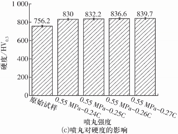 經(jīng)不同噴丸強度處理后8Cr4Mo4V鋼表面殘余應(yīng)力如圖14a所示,殘余壓應(yīng)力對噴丸強度不敏感。鋼丸直徑對材料殘余應(yīng)力的影響如圖14b所示,增加鋼丸直徑可在8Cr4Mo4V鋼表面引入更高的殘余壓應(yīng)力。8Cr4Mo4V鋼在不同噴丸強度下的表面顯微硬度如圖14c所示,與未處理試樣相比,噴丸后材料顯微硬度呈增加趨勢,最大增幅為11.1%。