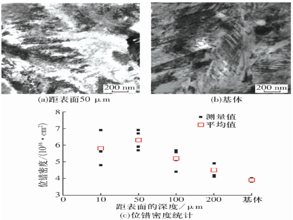 噴丸強化是一種應(yīng)用較為普遍的低成本表面處理技術(shù),可使材料表面發(fā)生不均勻塑性變形,產(chǎn)生壓應(yīng)力,形成應(yīng)變強化層和殘余壓應(yīng)力層。文獻[35]開展了8Cr4Mo4V鋼表面噴丸強化技術(shù)研究,并深入探討了相關(guān)機制。噴丸強化層距表面50 μm處和基體的TEM衍射襯度像分別如圖13a和圖13b所示,可以看出噴丸導致表層馬氏體發(fā)生強烈塑性變形,導致強化層的板條馬氏體邊界較為模糊,而基體板條界面清晰。噴丸強化層距表面不同深度處的{111}晶面上位錯密度統(tǒng)計結(jié)果如圖13c所示,噴丸強化層位錯密度較基體高約1倍,并且隨深度增加逐漸下降。