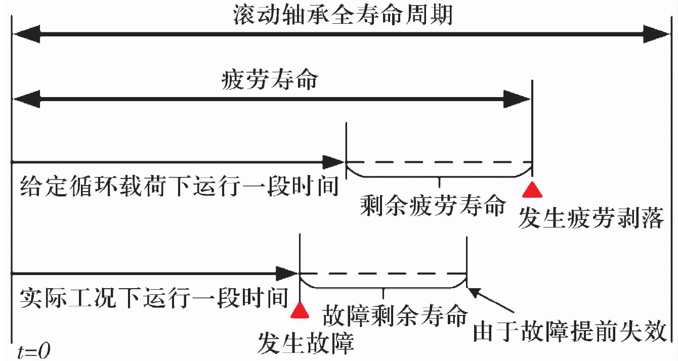 3)故障剩余壽命,指軸承在實際工況下累積運行一段時間發(fā)生故障后繼續(xù)運行至失效的時間。大型重載軸承的故障形式具有特殊性,很多情況下是由于故障導(dǎo)致壽命終止而不是常規(guī)的疲勞壽命問題,即故障剩余壽命指標(biāo)更為重要。