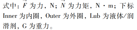 接下來(lái),計(jì)算在這種狀態(tài)下作用在各零件上的力和力矩。典型相互作用的例子是零件間的接觸力。采用Hertz接觸理論計(jì)算接觸力,其中幾何干涉由3D空間中單個(gè)零件的位置關(guān)系導(dǎo)出,通過(guò)油膜的量被定義為彈性近似值。通過(guò)這種方法,建立了運(yùn)動(dòng)方程來(lái)求解作用在各零件上的力和力矩。(2)和(3)式是滾動(dòng)體運(yùn)動(dòng)方程的例子。