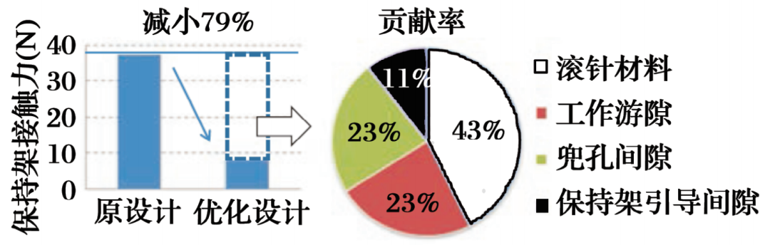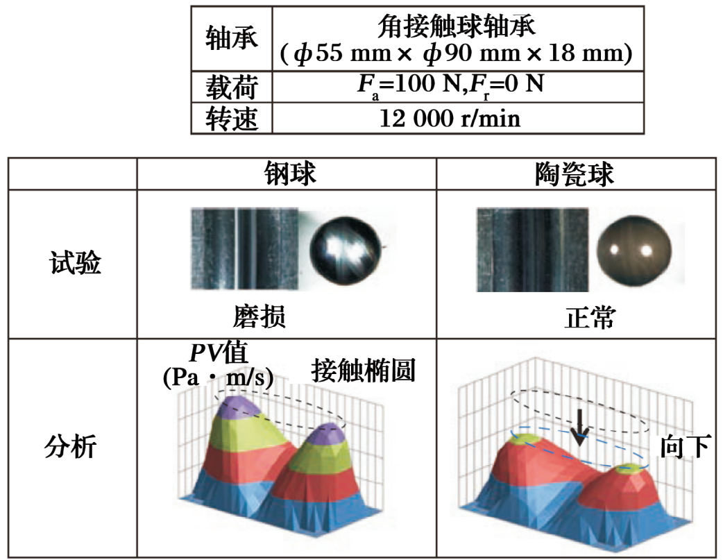 相同尺寸的鋼制和陶瓷球軸承接觸橢圓內(nèi)PV值分布的理論計(jì)算結(jié)果和溝道摩擦實(shí)測(cè)值如圖9所示。若球由軸承鋼制成,高速旋轉(zhuǎn)時(shí)會(huì)產(chǎn)生溝道摩擦,PV值增加。同時(shí),當(dāng)使用小質(zhì)量陶瓷球時(shí),實(shí)測(cè)中溝道摩擦被抑制,甚至通過(guò)分析證實(shí)溝道內(nèi)PV值下降。通過(guò)這種方法,利用S.S.A.P./MBD分析實(shí)際運(yùn)行工況下的球滑動(dòng),可預(yù)測(cè)溝道摩擦和卡死,并優(yōu)化內(nèi)部參數(shù)。